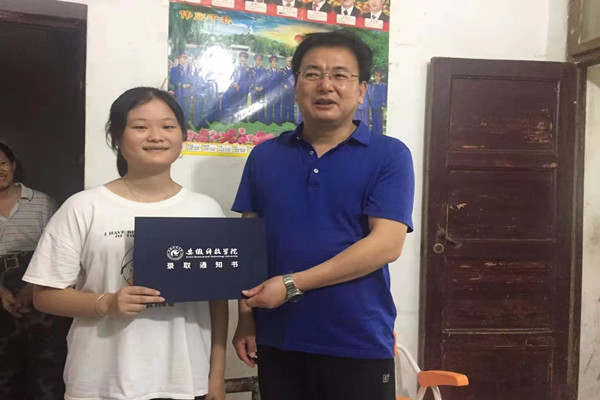 10日午间,在肥东县东方新城低矮的旧民居,黄友锐把录取通知书亲手交给2021级新生李惠康。李惠康以超一本线9分的成绩填报我校动物医学专业。得知李惠康父母均智力或身体残疾,由年迈的奶奶拉扯长大,黄友锐要求招生办负责人关心李惠康的报到入学,做好后续服务。